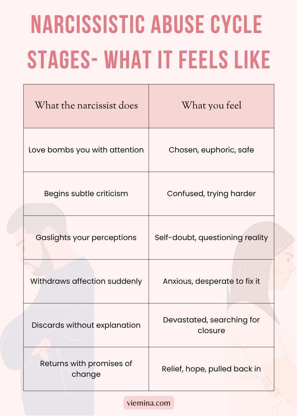 What makes this cycle so psychologically damaging is not any single stage but the pattern itself. The contrast between how good it feels during idealization and how painful it feels during devaluation creates a powerful emotional bond that is genuinely difficult to break — even when you can see what’s happening.