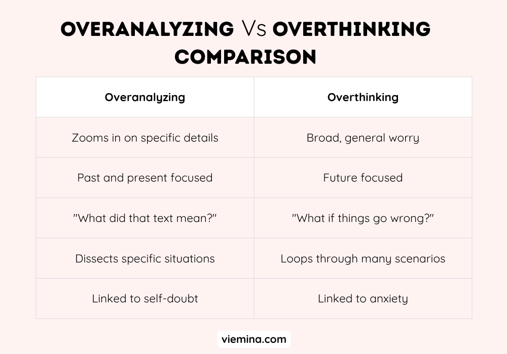 Overthinking tends to be broad and future-focused — worrying about what might happen across many scenarios. Overanalyzing is more specific and detail-focused — dissecting something that already happened, searching for hidden meaning in a specific conversation or situation. Both involve unproductive repetitive thinking, but overanalyzing tends to zoom in on particulars while overthinking ranges more widely.