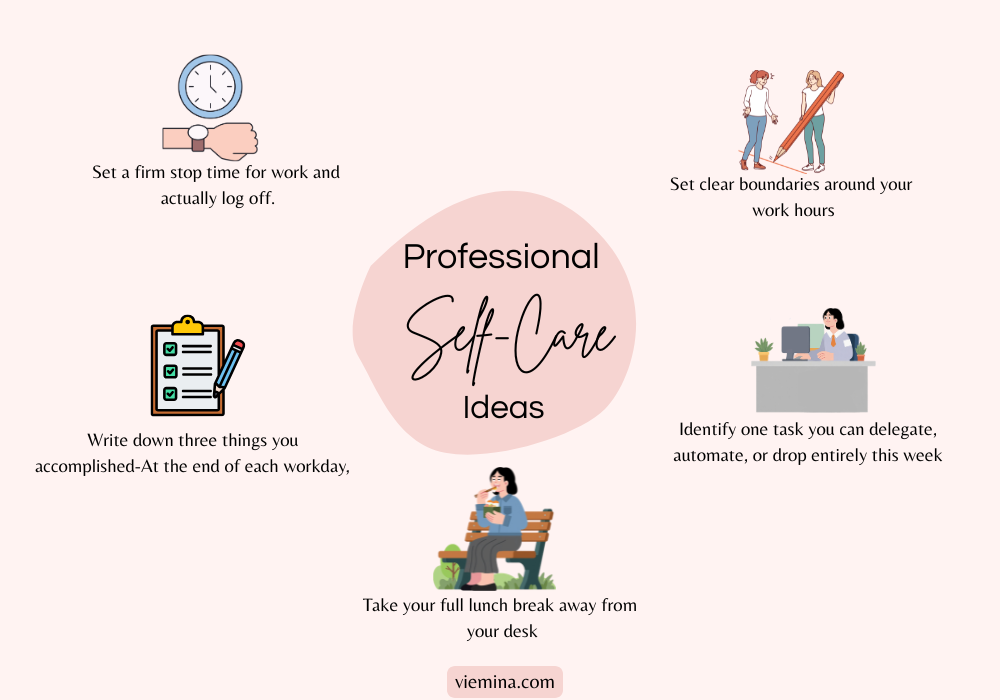 Work stress is one of the biggest contributors to burnout, and professional self-care is about protecting your energy at the source – not just recovering from the damage afterward.